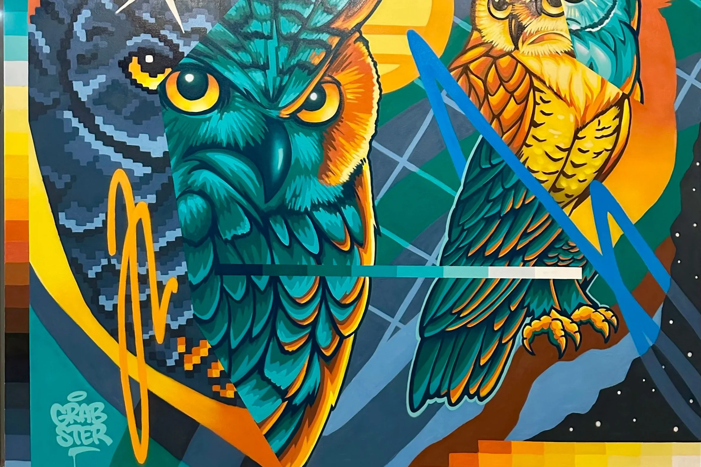 Born in Brazil, raised in New York, and developed in South Florida, Grabster pulls inspiration from decades of independent study and his eclectic upbringing to create colorful, dynamic, and skillful works. His technical expertise is a facet of his work, evident in his geometric and precise designs built to any scale.